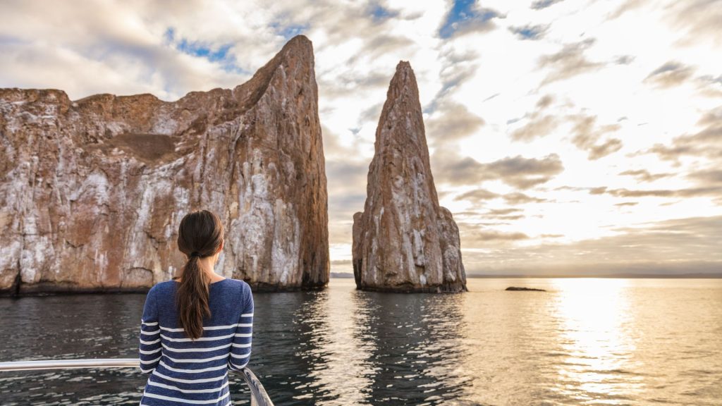 Visitors to Punta Suarez are welcomed by a large colony of marine iguanas, the only iguanas that dive for algae, earning the nickname “imps of darkness” from Darwin. Continuing on, a lookout offers views of a blowhole shooting water into the air. Española Island is home to the waved albatross, with a wingspan over 6.5 feet, performing intricate courtship dances during mating season. The coral sand beach at Witch Hill, visited by Darwin, is perfect for swimming and snorkeling, and attracts various birds, sea lions, and marine iguanas. The lagoon, occasionally dry, reveals salt deposits once mined by locals. At Gardner Bay, white sand and clear waters host sea lions and marine iguanas, inviting snorkeling. Nearby Osborn Islet is a nesting site for birds like blue-footed boobies and lava gulls.